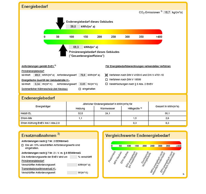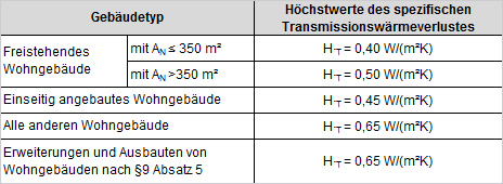 Die Anforderungen an Wohngebäude, die errichtet werden, sind im § 3 und in der Anlage 1 der EnEV geregelt. Nachzuweisen ist, dass der Jahresprimärenergiebedarf QP für Heizung, Warmwasserbereitung, Lüftung und Kühlung den Vergleichswert des Referenzgebäudes und die Anforderungen an den Transmissionswärmeverlustes HT nicht überschreitet (Nachweisverfahren). Zusätzlich muss der Nachweis zum sommerlichen Wärmeschutz nach DIN 4108-2 erbracht werden. Für die dämmtechnischen Nachweise aller Hüllflächen-Bauteile sind die Vorgaben der Anlage 1 einzuhalten.